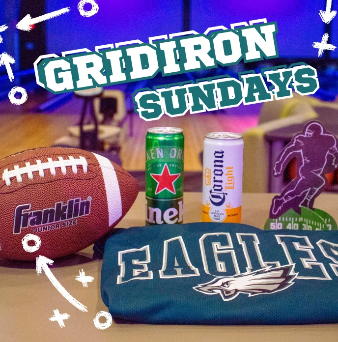 Your game-day HQ! Get our Gridiron Sundays deal: $50 Game Card + bonus credit, a FREE signature drink, Eagles fan perks, and double tickets at halftime.