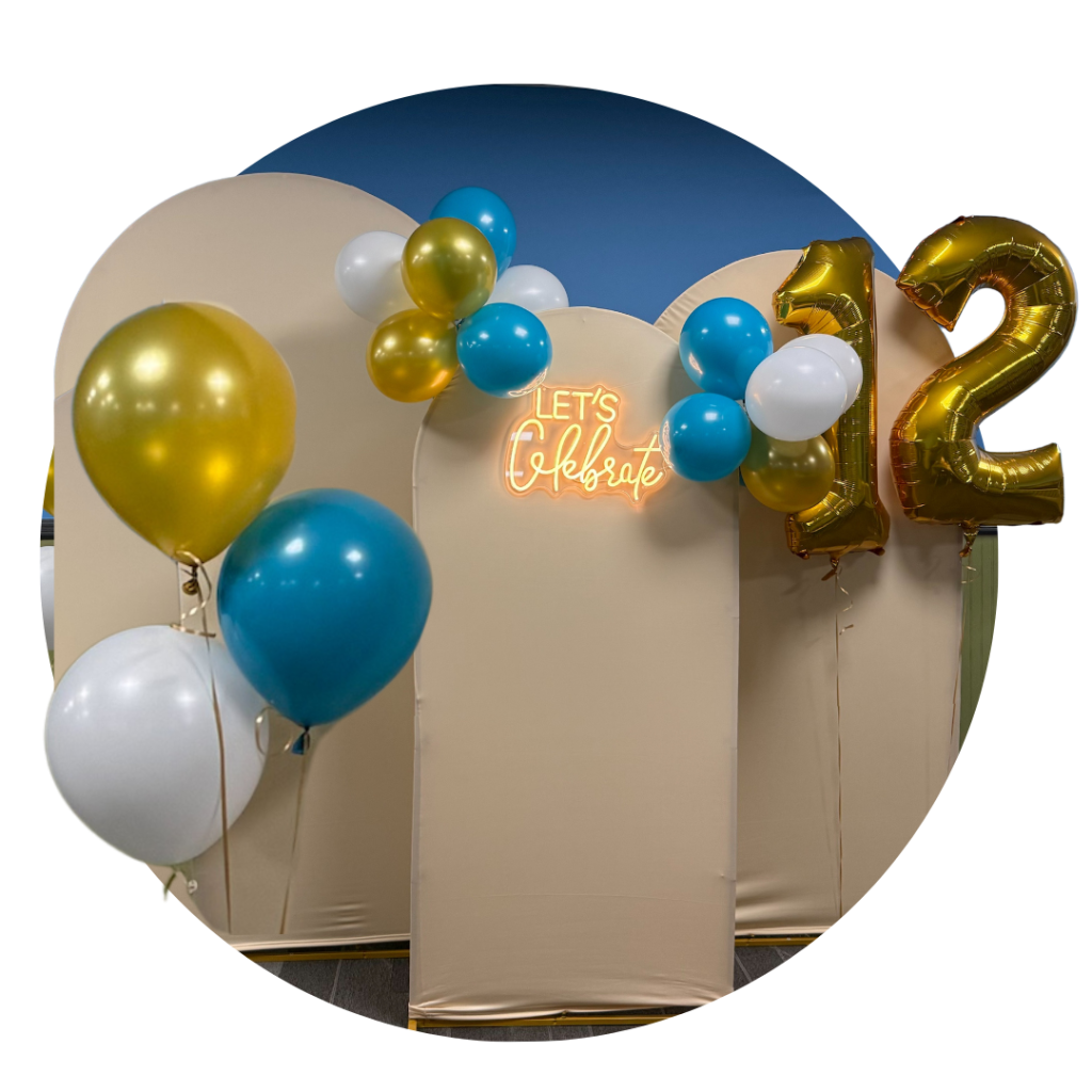 Create the ultimate photo moment with three decorative backdrop arches, a light up “Happy Birthday” or “Let’s Celebrate” sign, and a vibrant balloon set.