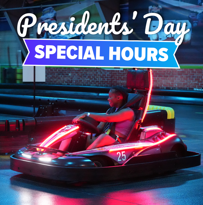 Celebrate Presidents’ Day Weekend with extended hours all weekend long! We’re open for the long weekend Friday, Feb 13 through Monday, Feb 16. Race our brand-new LED go karts, bowl with our infinite LED bowling screens, and make the most of your break!